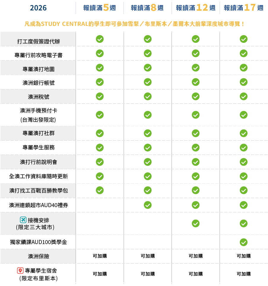 澳洲新生活,就從這一刻開啟!無論你想打工度假、留學還是遊學,從 6 歲到 60 歲,STUDY CENTRAL都是你最可靠的後盾。我們為你掃除出發前的焦慮,陪你實現 100 種可能的留澳計畫!