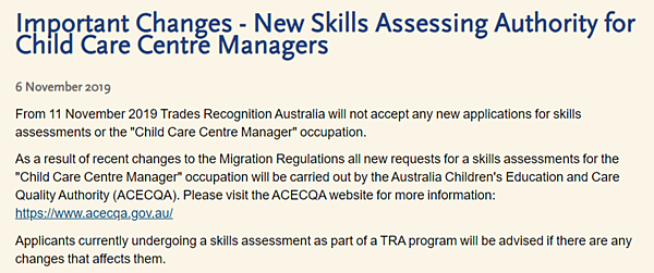 ☝️ 還在澳洲就讀幼教專業的背包客請密切注意!根據澳洲政府發布的消息,11/16起,原職業評估機構「TRA 將不再受理2種幼教職業的評估」: