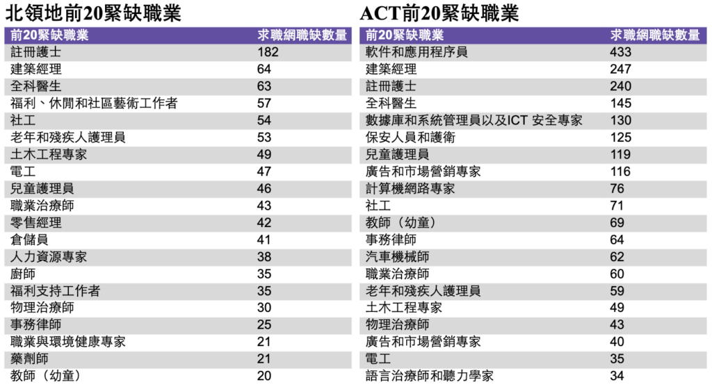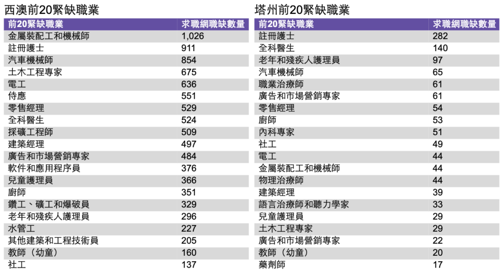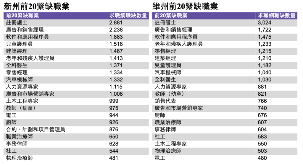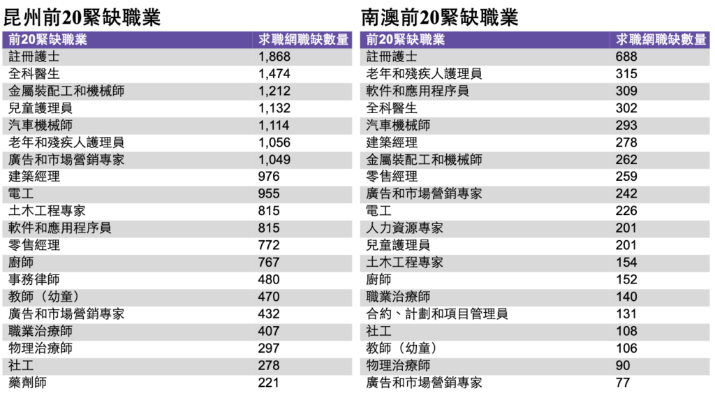 | 長訓練週期空缺 對學歷的要求高於平均且訓練時間較長,市場上缺少符合學歷的申請者 | 教師(幼童)職業治療師物理治療師註冊護士事務律師社工金屬裝配工和機械師電工 |