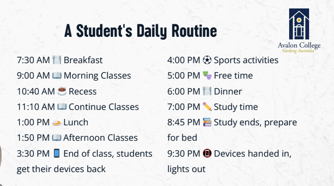 墨爾本最有學校氛圍的語言寄宿學校。小班10-14 人,每週25小時,課後有運動課程PE 4-5pm after class,包括澳洲各種球類有fressby, doghgyball rugby 等等,晚餐後有作業時間7:00-8:45pm homework time(每週8小時),週六日都有活動,學校老師帶,包吃住學活動。