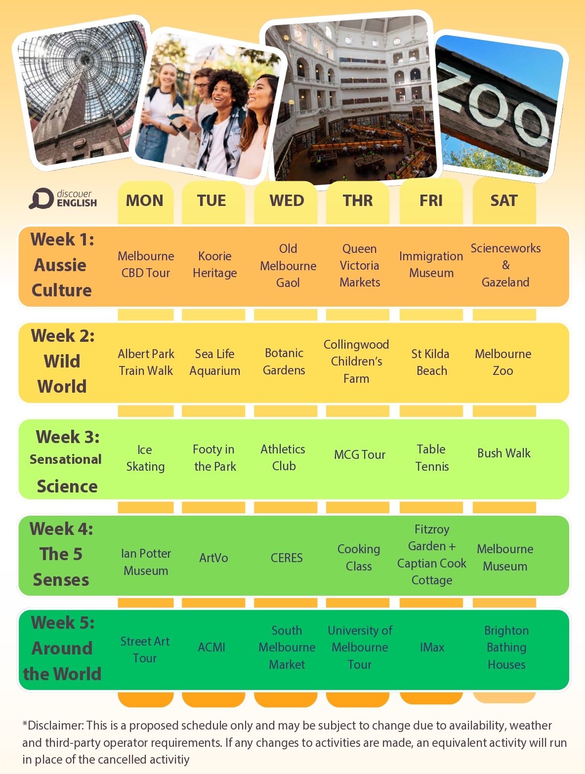 Discover English 的「青少年假期課程 (Junior Holiday Program)」是一個為期五週的英語教育課程(可報名1-5週),主要在北半球暑假期間運行 。在一個充滿趣味且悉心照料的環境中,培養學生的英語溝通能力 。對於年輕的學習者而言,這項假期計畫提供了一個絕佳的機會,讓他們在發展英語技能的同時,也能探索墨爾本這座多元且迷人的城市 。