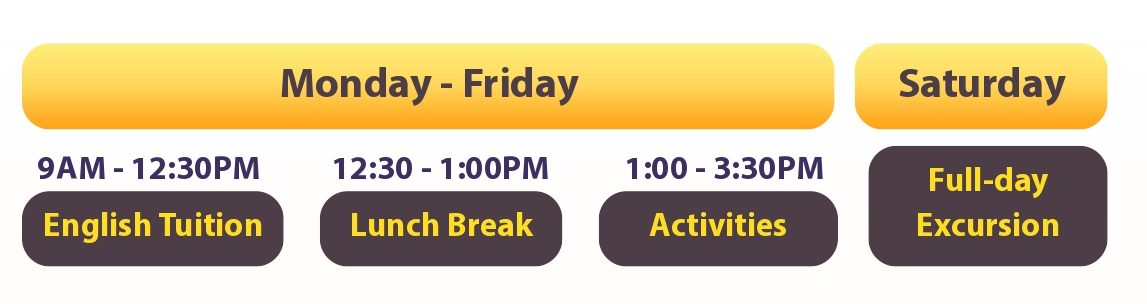 - 上課時間:週一到週五 9 am - 12:30 pm,每週15小時上課,下午&週六活動
