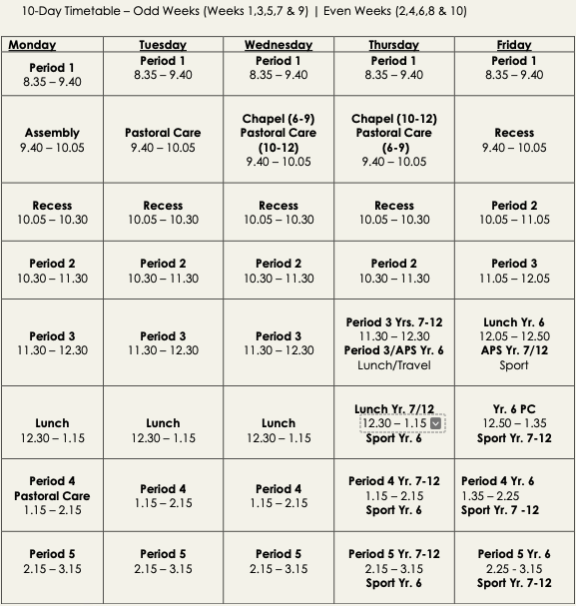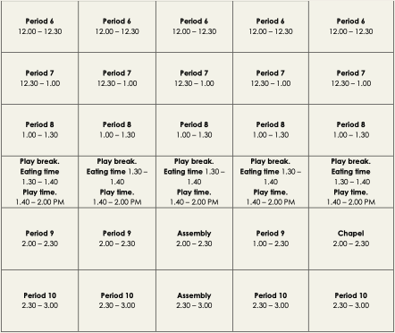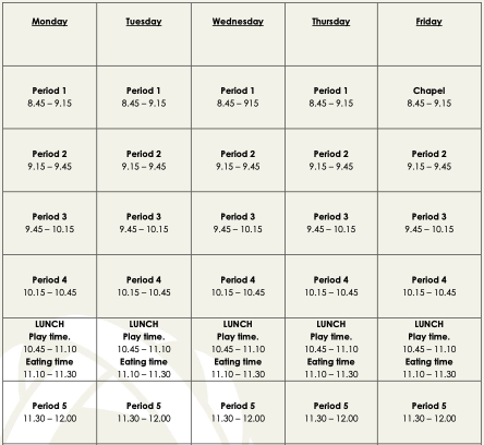 以下為學校的Timetable (Cotlew Street Campus, 8:40 – 15:00)