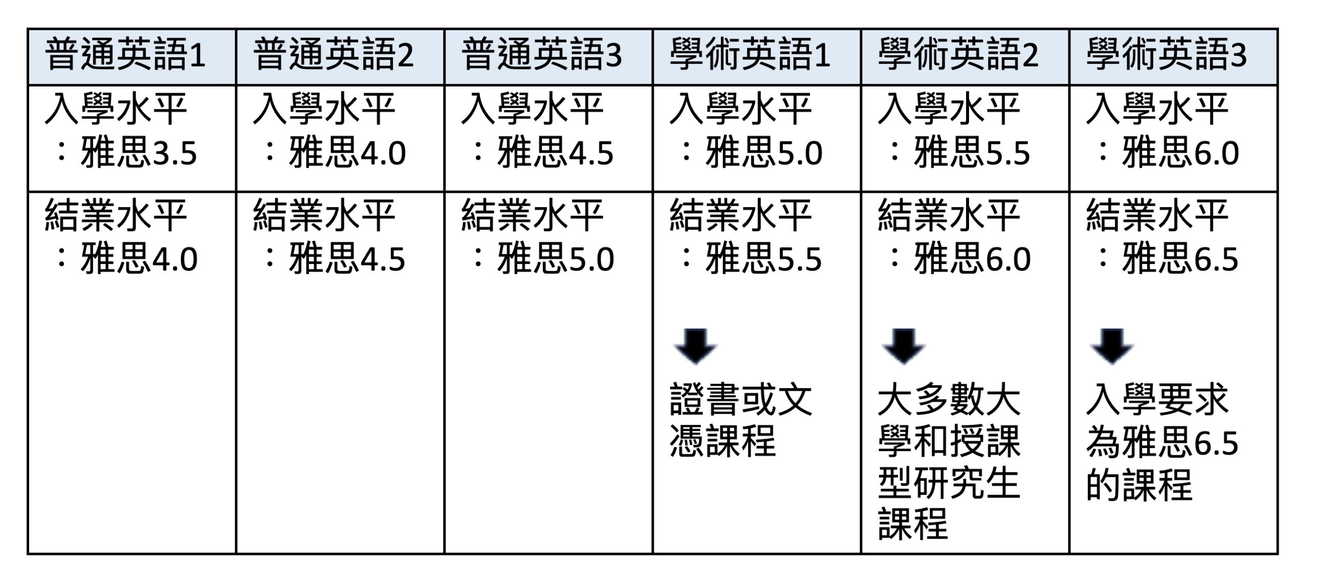 *用雅思成績來確定需要學習的課程課程時數,如沒有雅思成績,可參與英語語言內測。