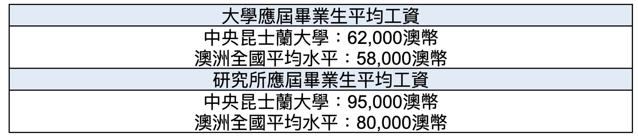 中央昆士蘭大學的畢業生擁有超高起薪,在Graduate Careers Council of Australia的報告中連續多年位居最高就業率大學Top 10,畢業起薪為5星級。CQU大學畢業生在澳洲的平均薪資約為$64,600澳幣/年,研究生平均薪資為99,100澳幣/年,比其他院校的應屆畢業生薪資更高!