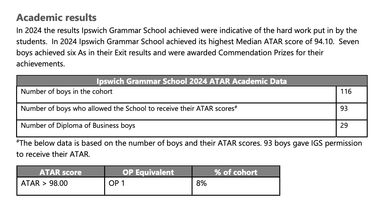 在 2024 年區域內公開的 NAPLAN 成績中,IGS 在 Ipswich 區為高中組最高,平均得分為 625.6 分。 2024 年度 12年級 的學生中,其 ATAR 表現為 94.10%。
