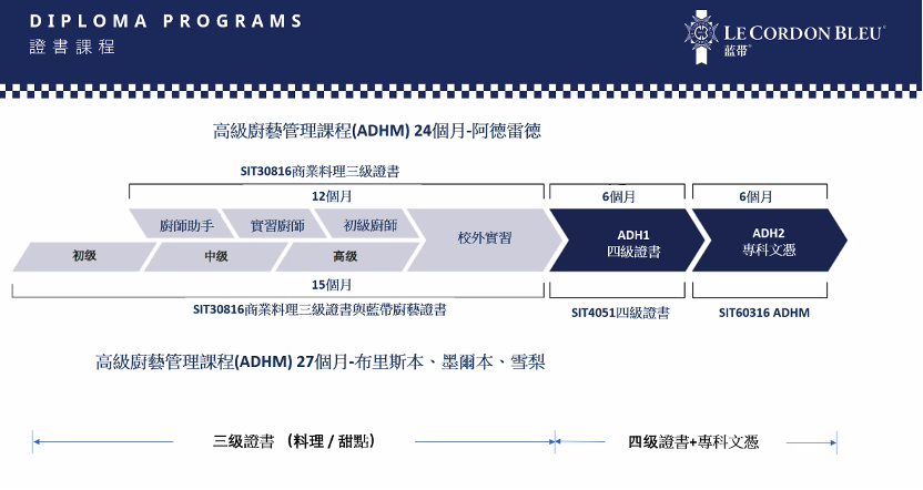 料理證書/甜點證書課程為藍帶的核心課程,每個校區皆有開課,墨爾本/雪梨/布里斯本校區的課程長度為15個月,修完課程的學生可以擁有澳洲政府認可的三級證書 + 藍帶廚藝證書。