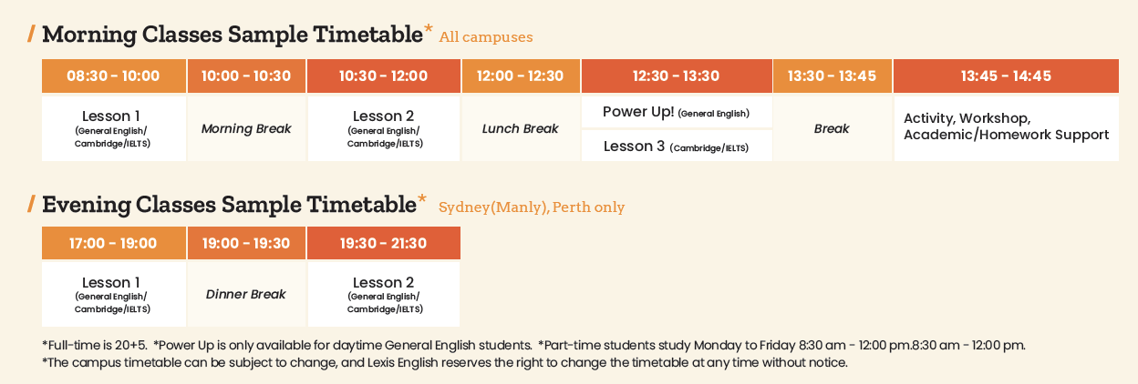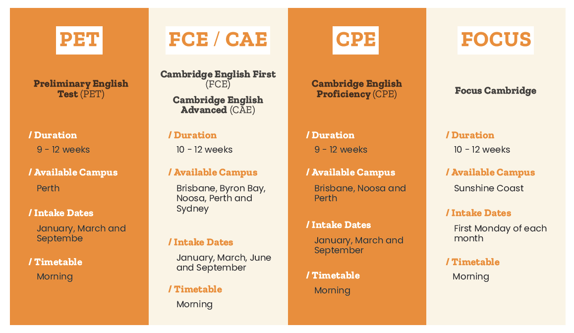 上課校區:陽光海岸、拜倫灣、努沙、伯斯、布里斯本、雪梨