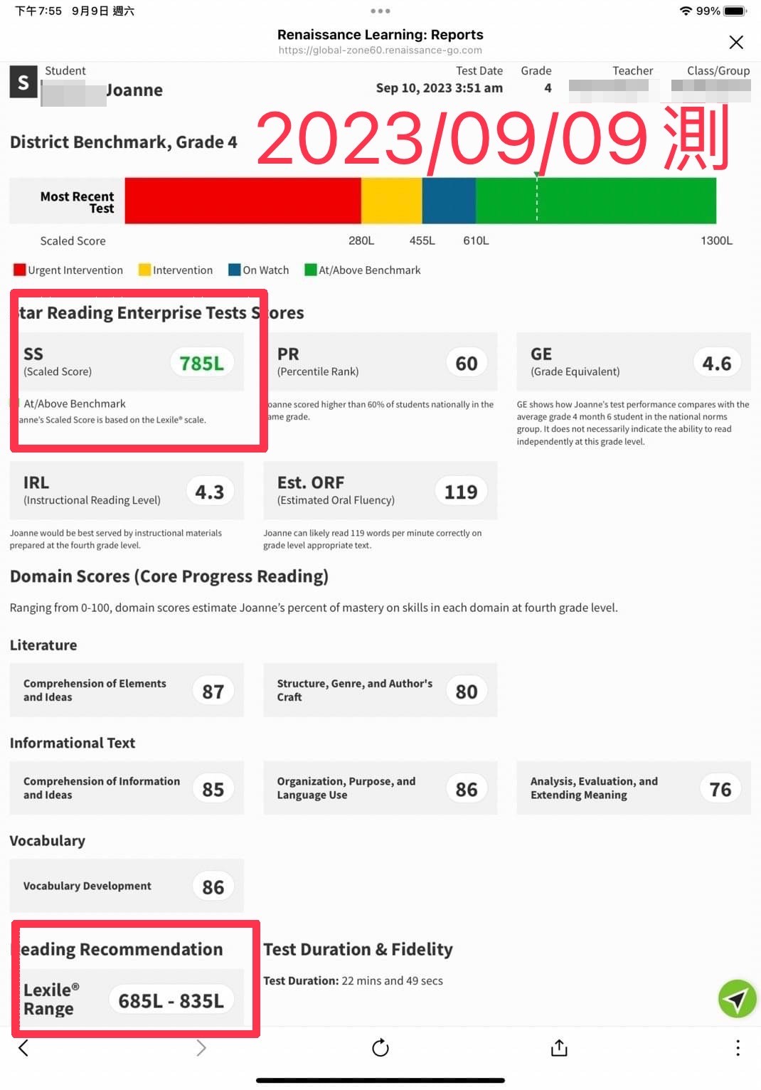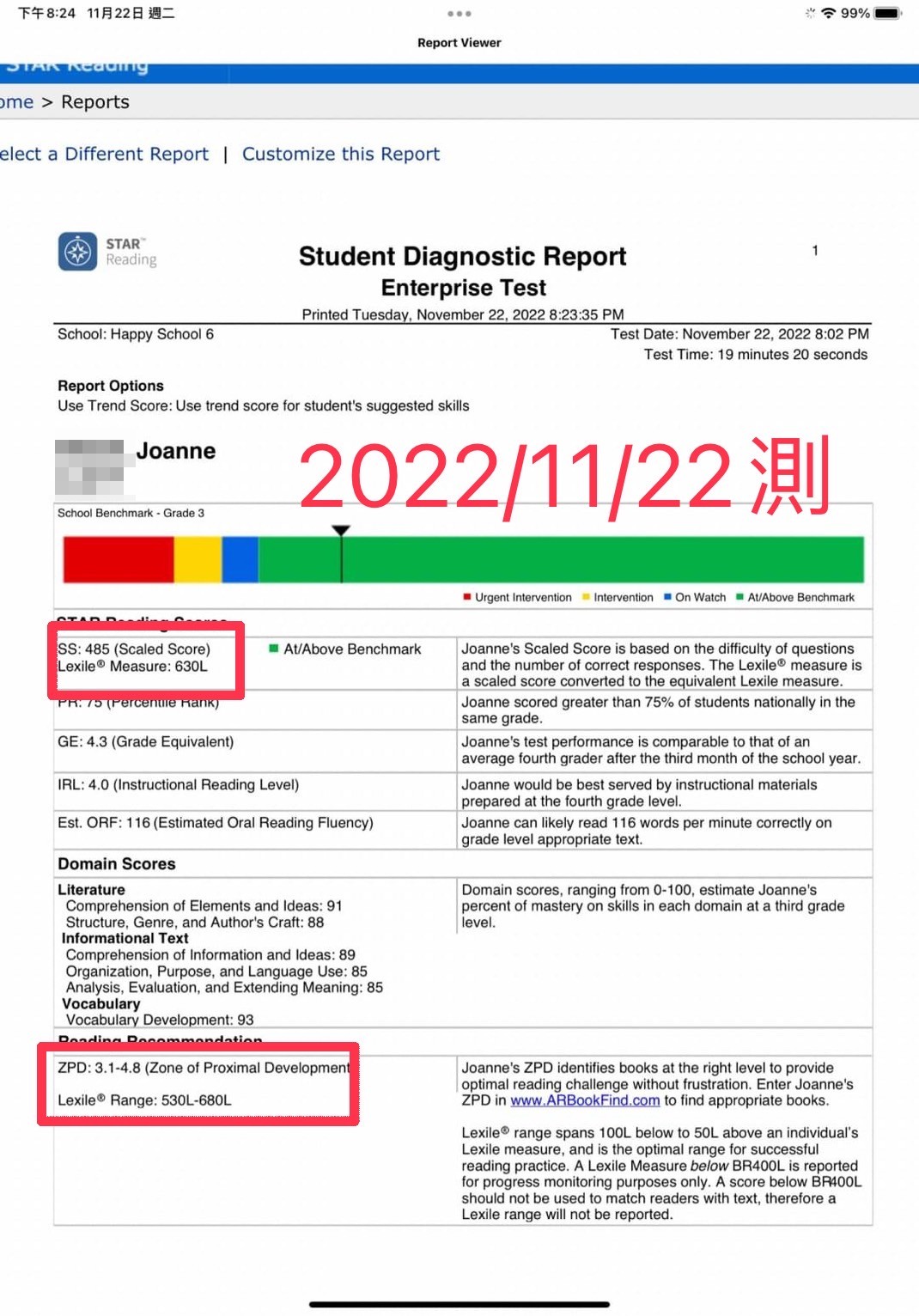 但口說無憑,直接分享成果:從澳洲回來以後,Joanne的Lexile藍思直接從485提升到785L。