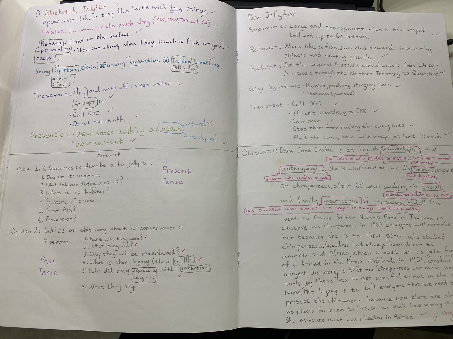 最有收穫的是:本子裡有一篇她自己查維基百科找的珍古德(Dame Jane Goodall) 資料,她可以根據老師上課的提示引導,看完百科,整理腦袋,用自己的想法敘述這個人。