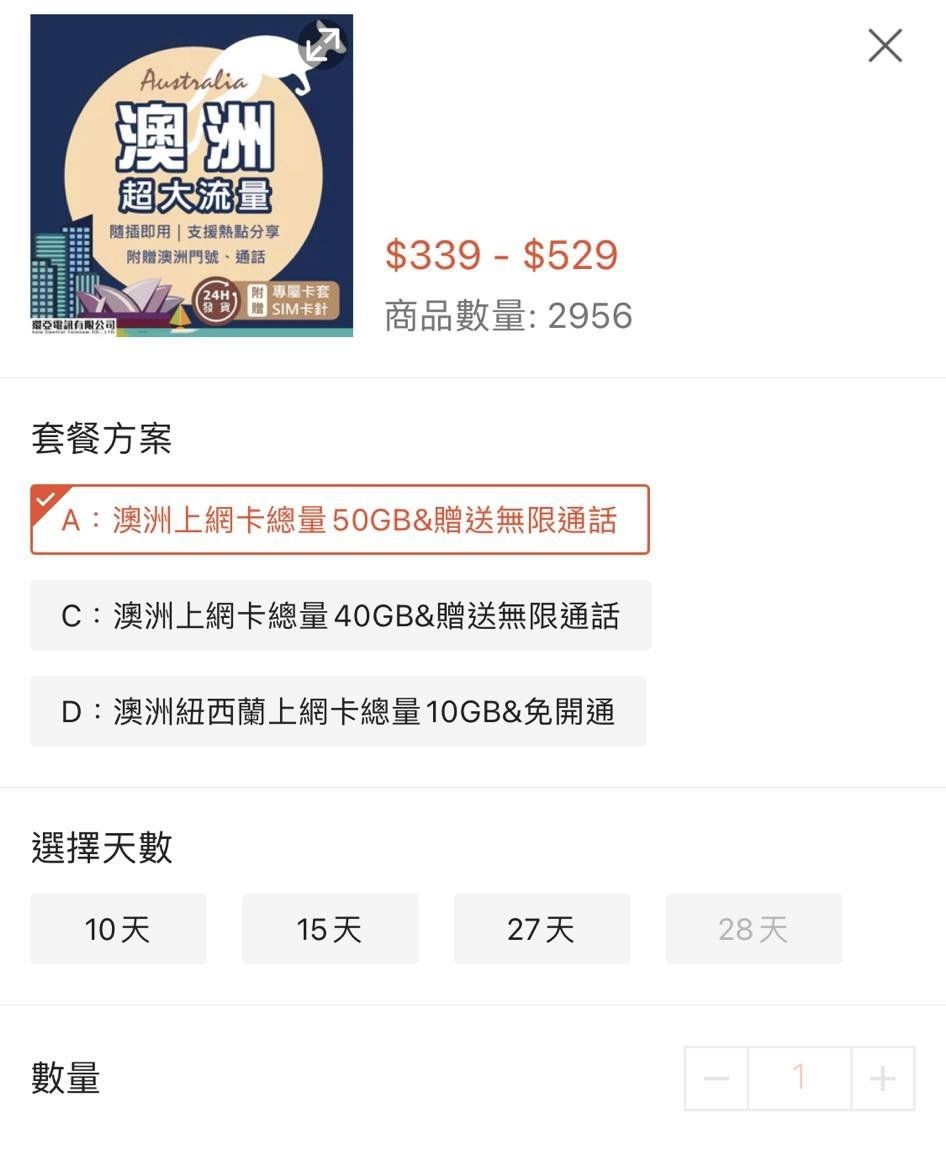 阿母我第一次到墨爾本,扛著三大箱行李(在墨爾本又買了一咖),還帶著一個傻白甜,很怕分心,所以出發前先在蝦皮買了28天50G的2張卡,下飛機直接隨插隨用。