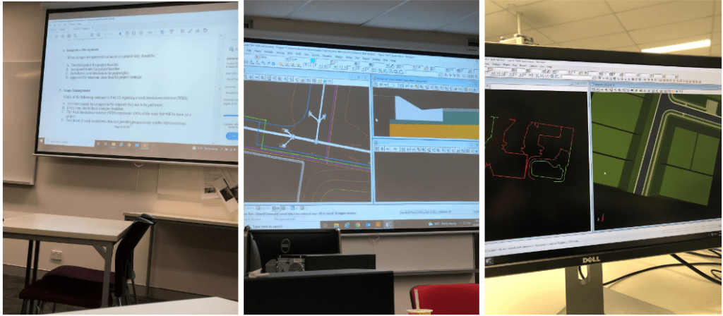 實作的方面Tafe教了很多土木工程會使用到的軟體像是AutoCAD、12D 、 Revit。AutoCAD是每一學期都會使用到的軟體,學起來也不困難。 實作課程還多了一門測量課,每次上課都會實際到戶外操作測量機器,是蠻特別的體驗。理論方面的課程蠻注重數學跟力學的計算,但我覺得學校這方面教的非常好,也很容易理解,我高中的時候數學每次都不及格,來澳洲後突然覺得數學很簡單,只要肯付出時間,想到拿到高分並不會太困難。