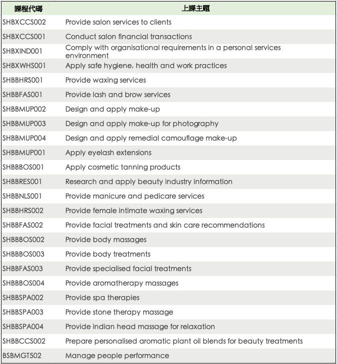 課程必修內容:使用日曬機、睫毛眉毛服務、提供除毛服務、彩妝設計、手足保養、全身按摩、如何處理美容院的基礎財務⋯等。