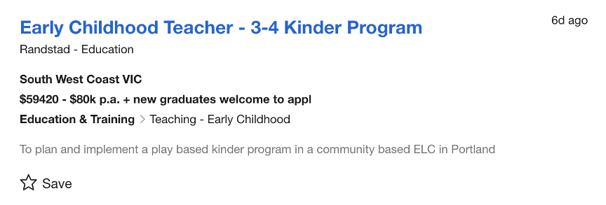 從事幼教老師的薪水多少呢?我們也查了SEEK.COM其中一項幼教老師的給薪,依照經驗值,澳洲的幼教老師起薪從年薪澳幣$59,420~$80,000,這薪水是不是挺吸引人的!
