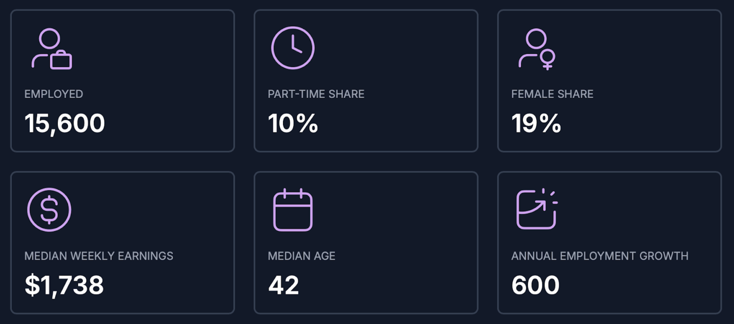 - 全職收入中位數為每週 1,738 澳幣,高於所有工作的中位數(1,697 澳幣)。