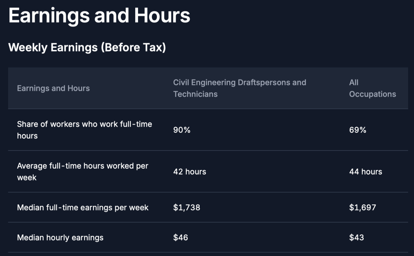 綜合來看,土木工程製圖師在澳洲是個高度專業且穩定的職位,不僅有著優於平均的薪資水準,工作時數也相對合理,顯示其在工程領域中的重要性和受重視程度。