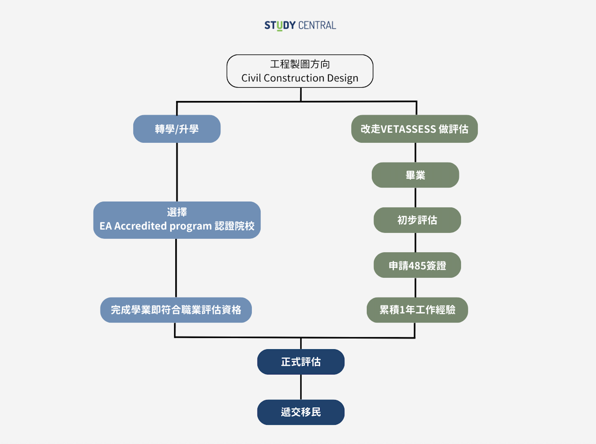 選擇土木工程製圖的課程都需要注意課程內容,除了學習時間至少兩年並取得Diploma以上Advanced Diploma/Associate degree的學歷,才能通過EA或Vetassess職業評估。若要最容易通過職業評估的話首推選擇EA認證課程,畢業不用工作經驗就可以通過職業評估;若入讀的學校非EA認證課程也不用太擔心,畢業後累積一年的相關工作經驗還是可以走Vetassess的職業評估。