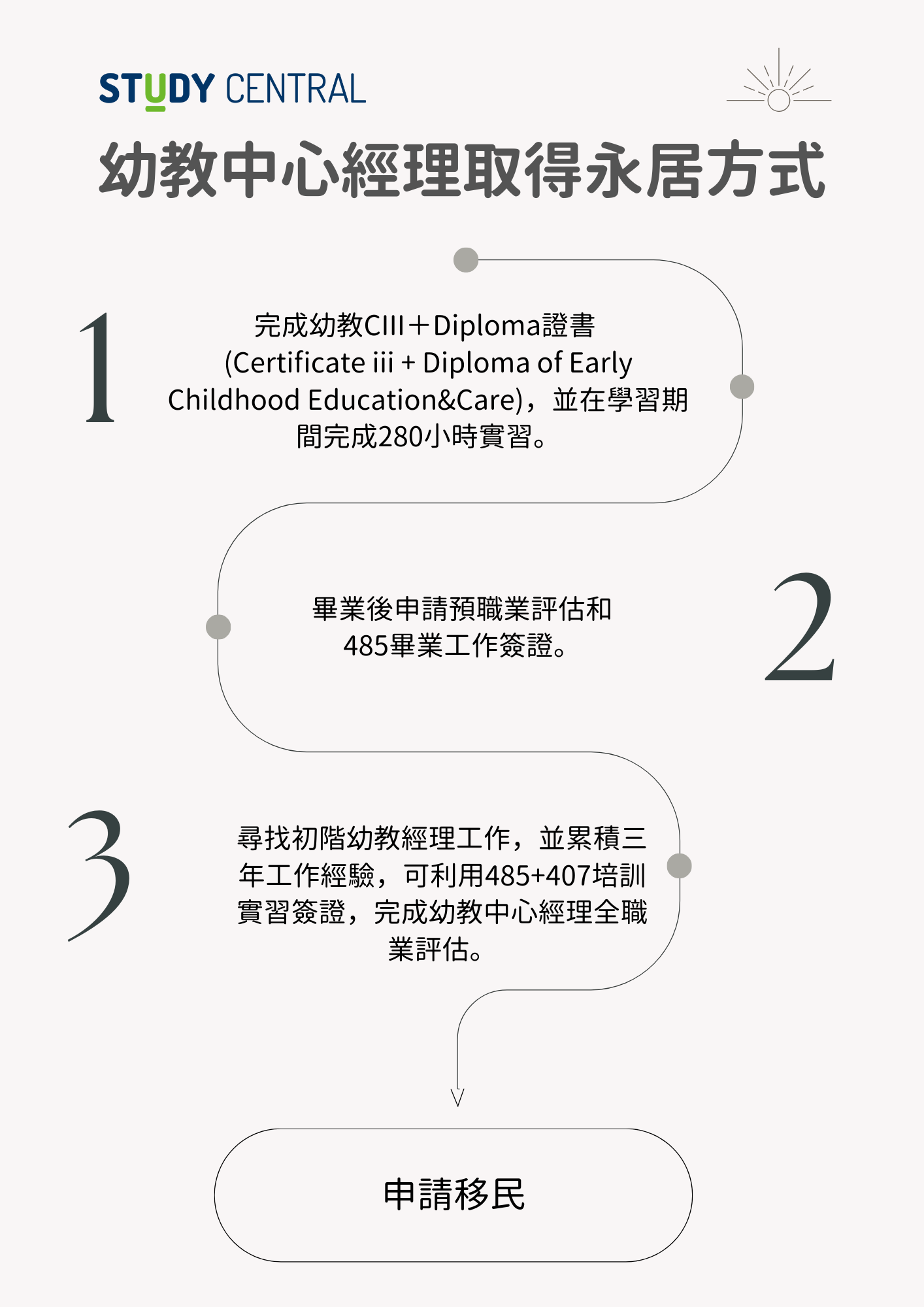 - Step 3:尋找初階幼教經理工作,並累積 3 年工作經驗,可利用 485 + 407 培訓實習簽證,完成幼教中心經理全職業評估
