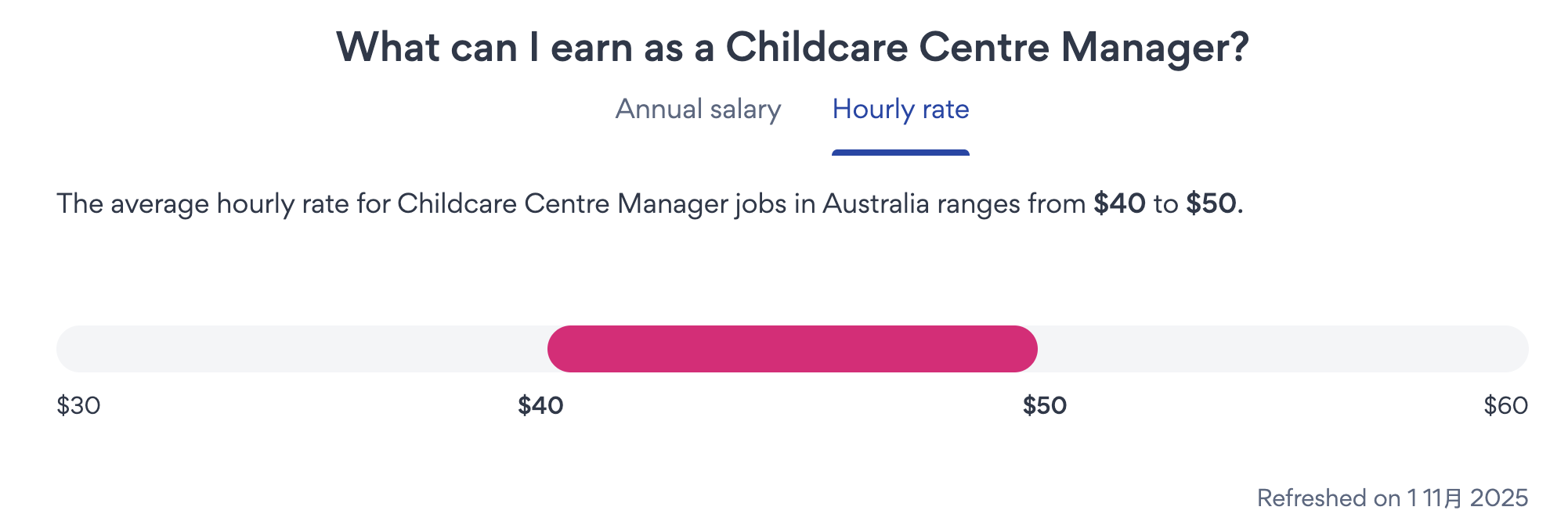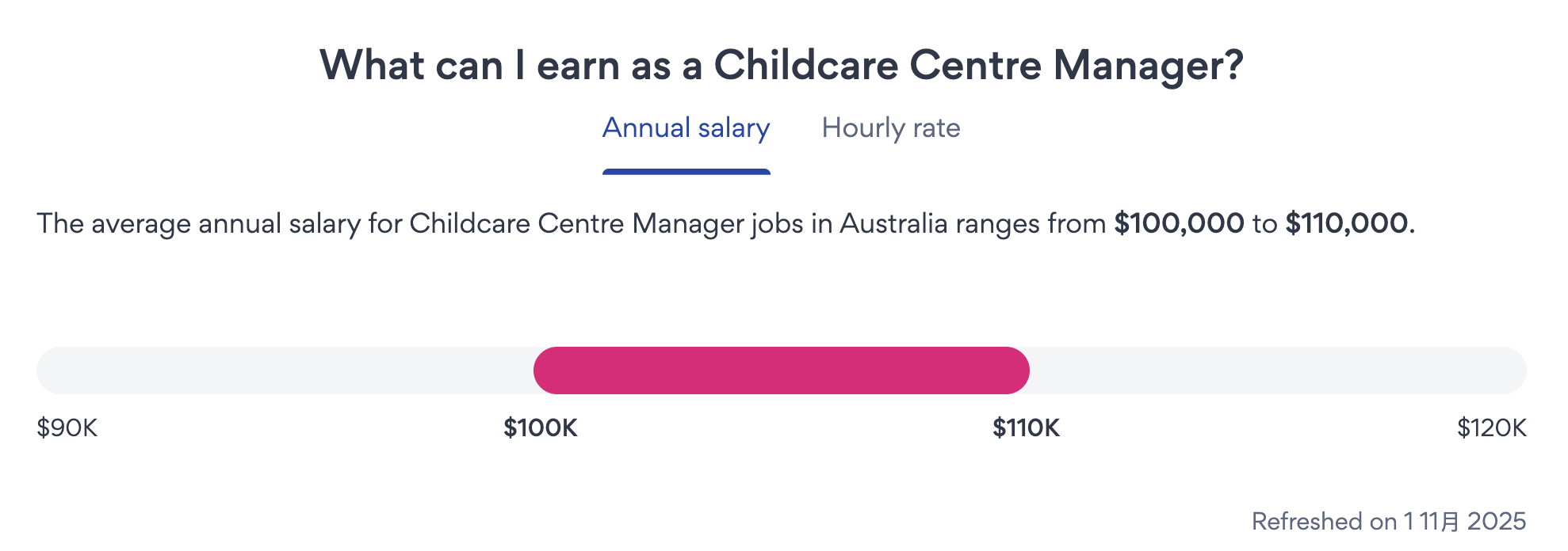 據 Seek 統計,幼教中心經理平均年薪為澳幣$100,000~$110,000,時薪為澳幣$40~$50。而且未來五年有持續成長趨勢,成長率為 21.8%。