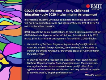 若你從來沒讀過任何幼教課程,但你已經在澳洲學過任何一個移民專業項目,包括會計、IT、護理、社工等,但卻因找工作困難或雅思成績就是衝不上去,而阻擋了你目前的移民計畫,那轉唸由RMIT(墨爾本皇家理工大學)所提供的「幼教碩士文憑 (Graduate Diploma in Early Childhood Education」,只需要一年的時間,畢業時也可直接豁免申請移民所需要的英文要求!同時又在最短期有效之下取得你的第二項移民專業,絕對只會提升你移民成功的機率和籌碼!