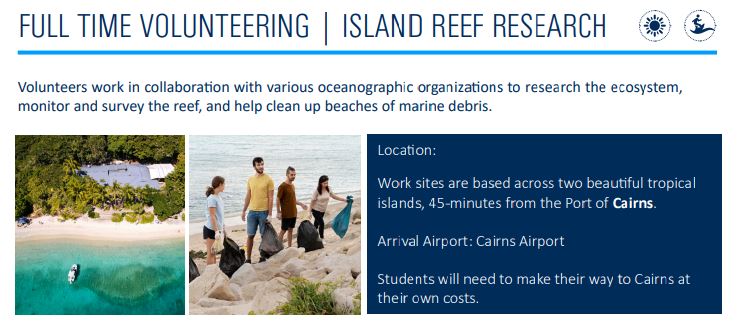 此志工計畫能讓參加的志工可以在下午、晚上和週末自由探索昆士蘭遠東北部,這個地點正受到珊瑚白化、污染、採礦、過度捕撈和氣候變遷等因素的嚴重威脅。