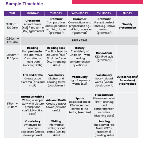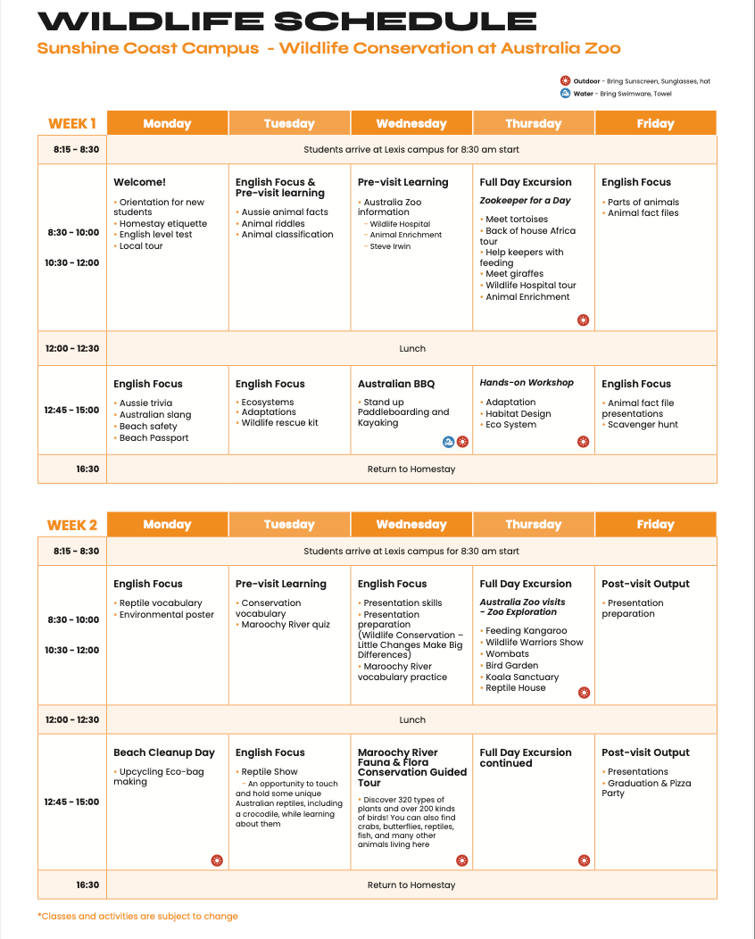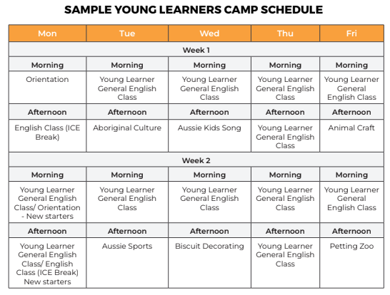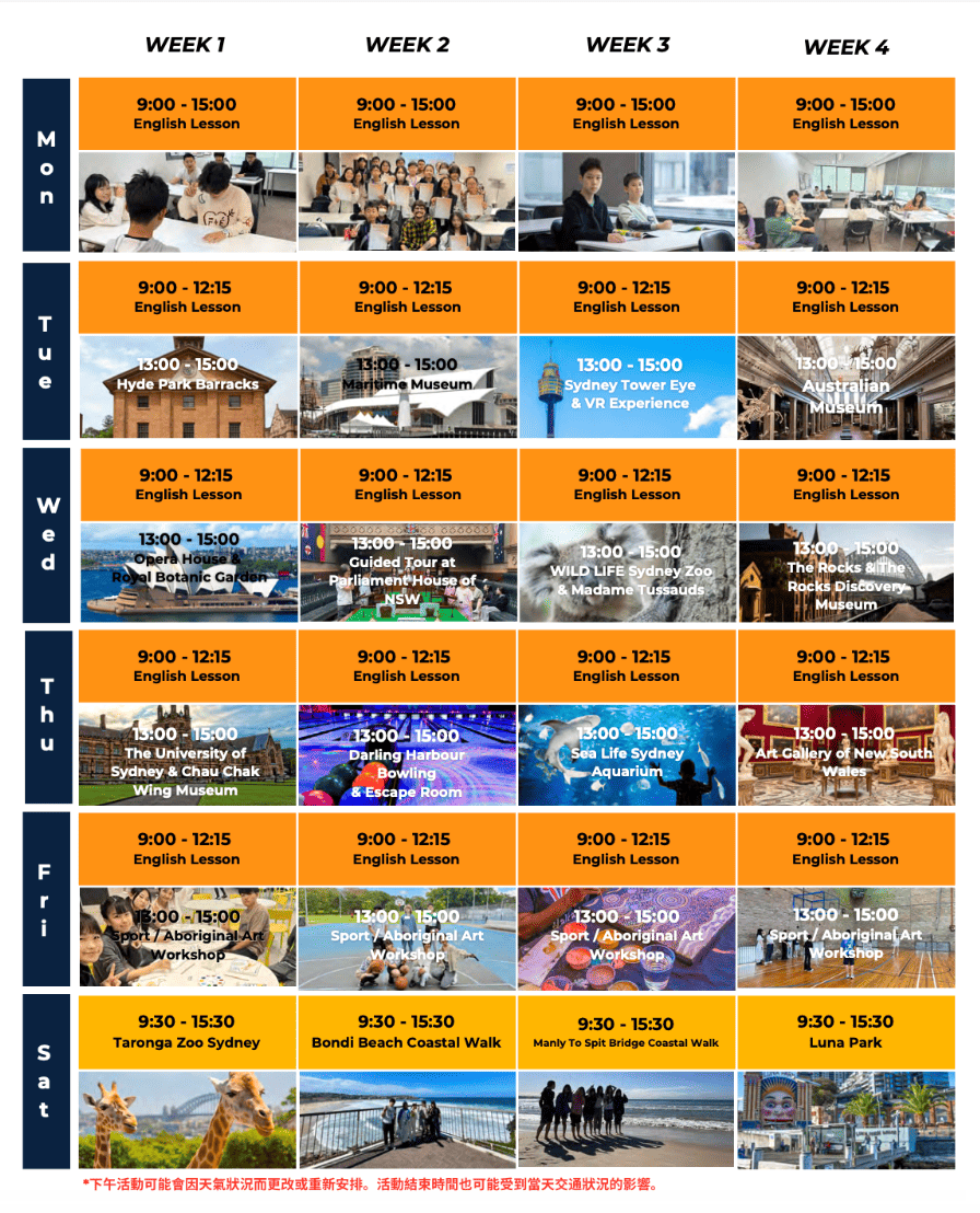 大部分學校安排上午三小時在教室內教學的英文課程,下午由老師帶出校園活動或是在校內進行團康遊戲,有些學校甚至會安排週六及週日一整天的校外教學日,目的是為了讓小孩喜歡英文和體驗澳洲活動,這些活動過程孩子會自然使用英文和周圍的人交流,透過課程以外的方式提升語感和英文口說聽力能力。
