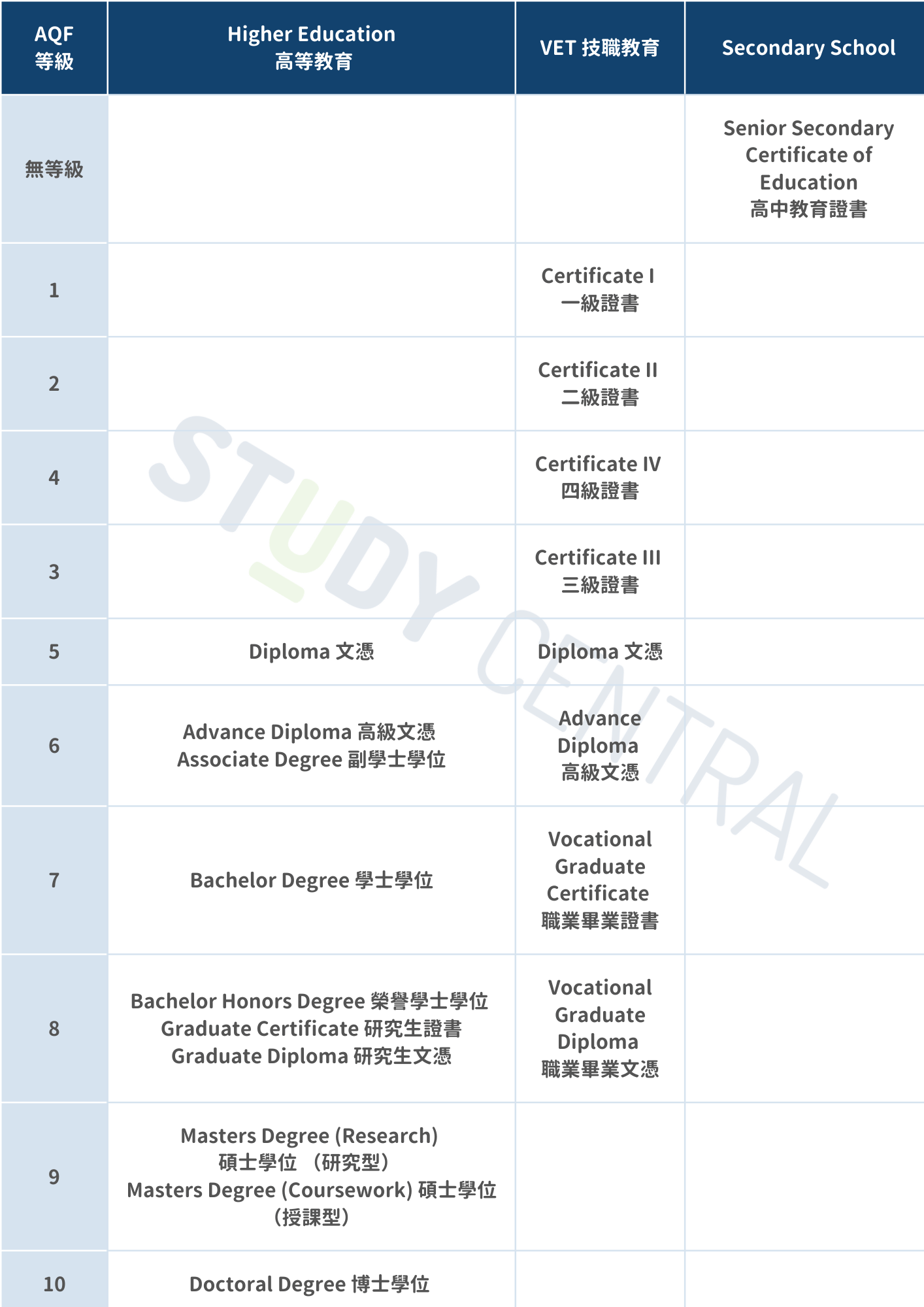 AQF是一項國家政策,涵蓋的學歷資格包括全國的高等教育、職業教育與培訓以及高中教育。AQF分10個等級,它將高中教育、職業教育與培訓及大學教育的學歷資格評估整合為一個國家認證體系。根據學習的難度、廣度和深度不同,由1至10逐級增高。若國際學生要降級讀書(從AQF級別高的往下讀)或是轉換主課程,必須確認是否符合8202簽證條款,否則簽證可能會被取消。以下例子說明學生需要申請新的學生簽證並且需要獲批