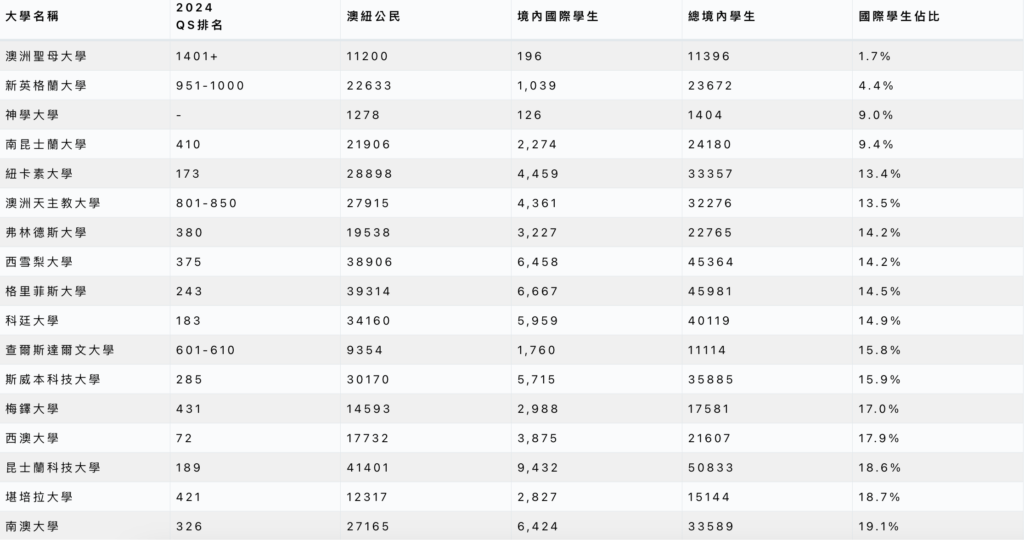 有4所學校的國際學生人數低於10%,其中澳洲聖母大學和新英格蘭大學與其他大學的差距非常大,聖母大學竟然只有200多位國際學生,新英格蘭大學也僅有1000多位國際學生。