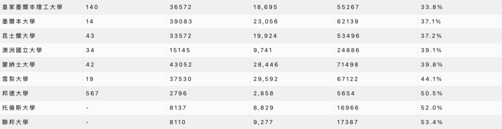 值得注意的是,由於數據所限,表二和表三的數據並沒有扣除遠距和非澳洲校區的國際學生人數。另外為了更準確的反映大家在大學裡面上課的情況,我們沒有把PhD、研究型碩士、文憑課程的學生算進去。