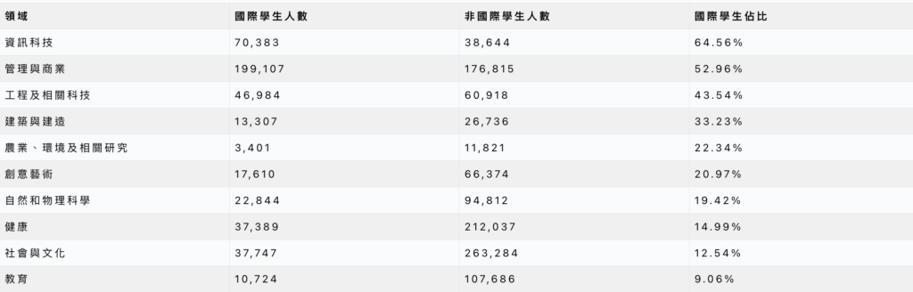 從上表可見,有超過43%的國際學生選擇讀商科,遙遙領先於其他領域。會導致這個情況有多個原因,第一,商科是最多遠距課程的領域,由於我們無法扣除遠距的學生,理所當然國際學生人數也會更多;第二,商科是供應最多的課程,商科領域從傳統的經濟、金融、會計,到供應鏈、行銷、創業等等,各大學都開設非常多的課程,能容納的學生多;第三,留學的知識和技能更容易轉移到自己的國家,這一點可以從農業、教育的國際學生人數得到印證,不是每一個國家都有蓬勃發展的農業,以及每一個國家的教育系統都不一樣,反觀商科、IT都有高度的制式化。