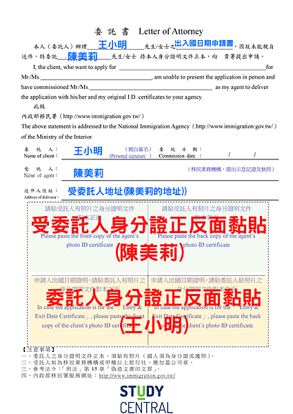 →帶著申請表、委託書及雙方有效證件(如護照、身分證等)的正本及影本前往移民署