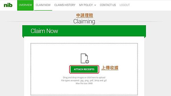 點選頁面最上方的CLAIM NOW,然後上傳收據即可。